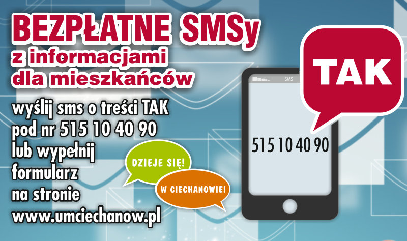 Z urzędu wysyłane będą informacje o ważnych lokalnych wydarzeniach, imprezach kulturalnych, sportowych, akcjach społecznych, zagrożeniach, awariach, utrudnieniach, sprawach urzędowych, terminach. By otrzymywać darmowe wiadomości wystarczy zarejestrować się wysyłając SMS o treści „tak” pod numer 515 10 40 90 (koszt SMS zgodnie z taryfą operatora) lub wypełnić formularz na stronie internetowej www.umciechanow.pl Rejestracja do systemu równoznaczna jest z akceptacją regulaminu, który znajduje się na stronie www.mprofi.pl/regulaminy. Możliwe jest również otrzymywanie wiadomości głosowych.