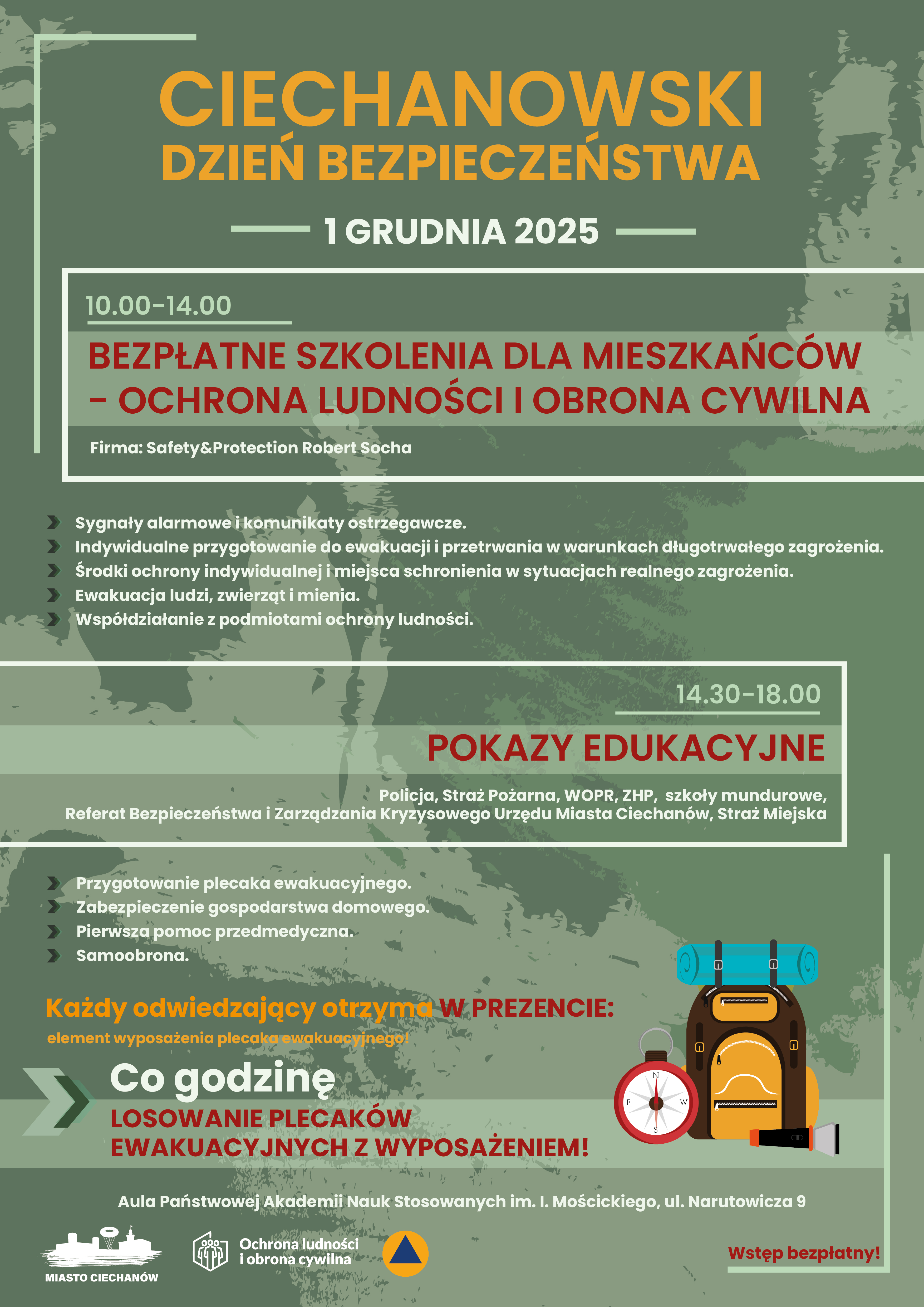 Każdy mieszkaniec Ciechanowa, który weźmie udział w Ciechanowskim Dniu Bezpieczeństwa otrzyma bezpłatnie element wyposażenia plecaka ewakuacyjnego. Ponadto co godzinę spośród uczestników wydarzenia losowane będą plecaki ewakuacyjne z elementami wyposażenia.