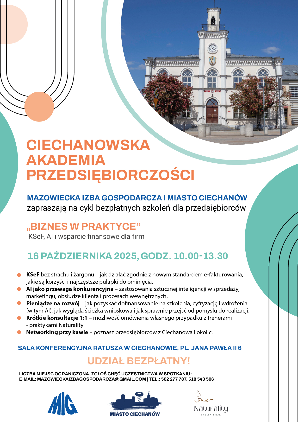 16 października (czwartek) w ratuszu zainaugurowany będzie tegoroczny cykl bezpłatnych szkoleń dla przedstawicieli lokalnego biznesu. Ciechanowską Akademię Przedsiębiorczości organizuje Mazowiecka Izba Gospodarcza przy wsparciu miasta. Na spotkaniu poruszone będą kwestie dotyczące KSeF, AI i środków finansowych na prowadzenie firm. Poza prelekcjami na miejscu będzie można odbyć konsultacje z ekspertami i wziąć udział w części networkingowej, która jest okazją do nawiązania współpracy między firmami.