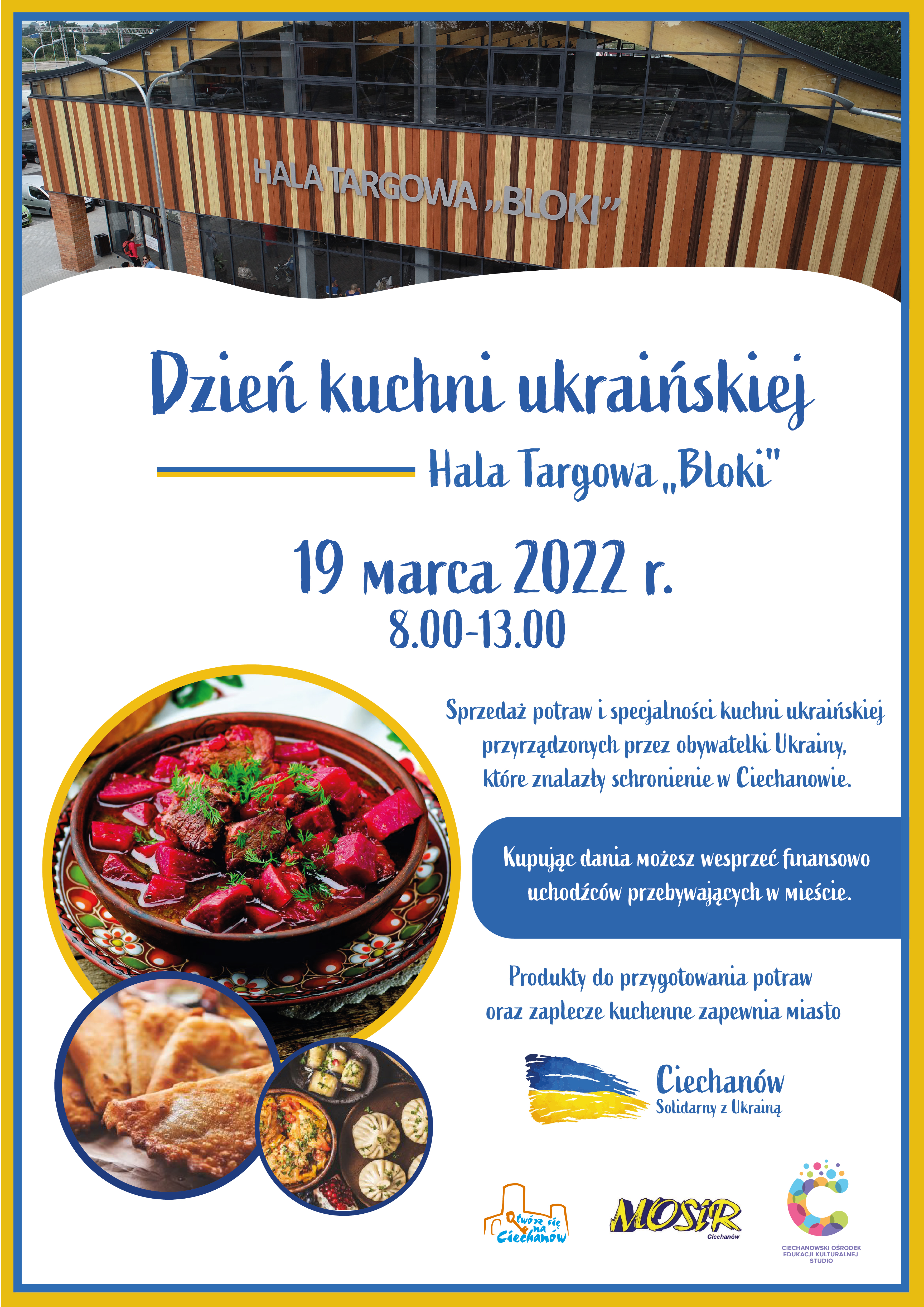 W sobotę (19 marca) mieszkańcy będą mogli zakupić tradycyjne potrawy kuchni ukraińskiej przygotowane przez przebywające w mieście obywatelki Ukrainy, które znalazły schronienie w Ciechanowie. Akcja potrwa od godz. 8.00 do 13.00 w miejskiej Hali Targowej „Bloki”. Cały przychód ze sprzedaży produktów bezpośrednio wesprze uchodźców przebywających w Ciechanowie.