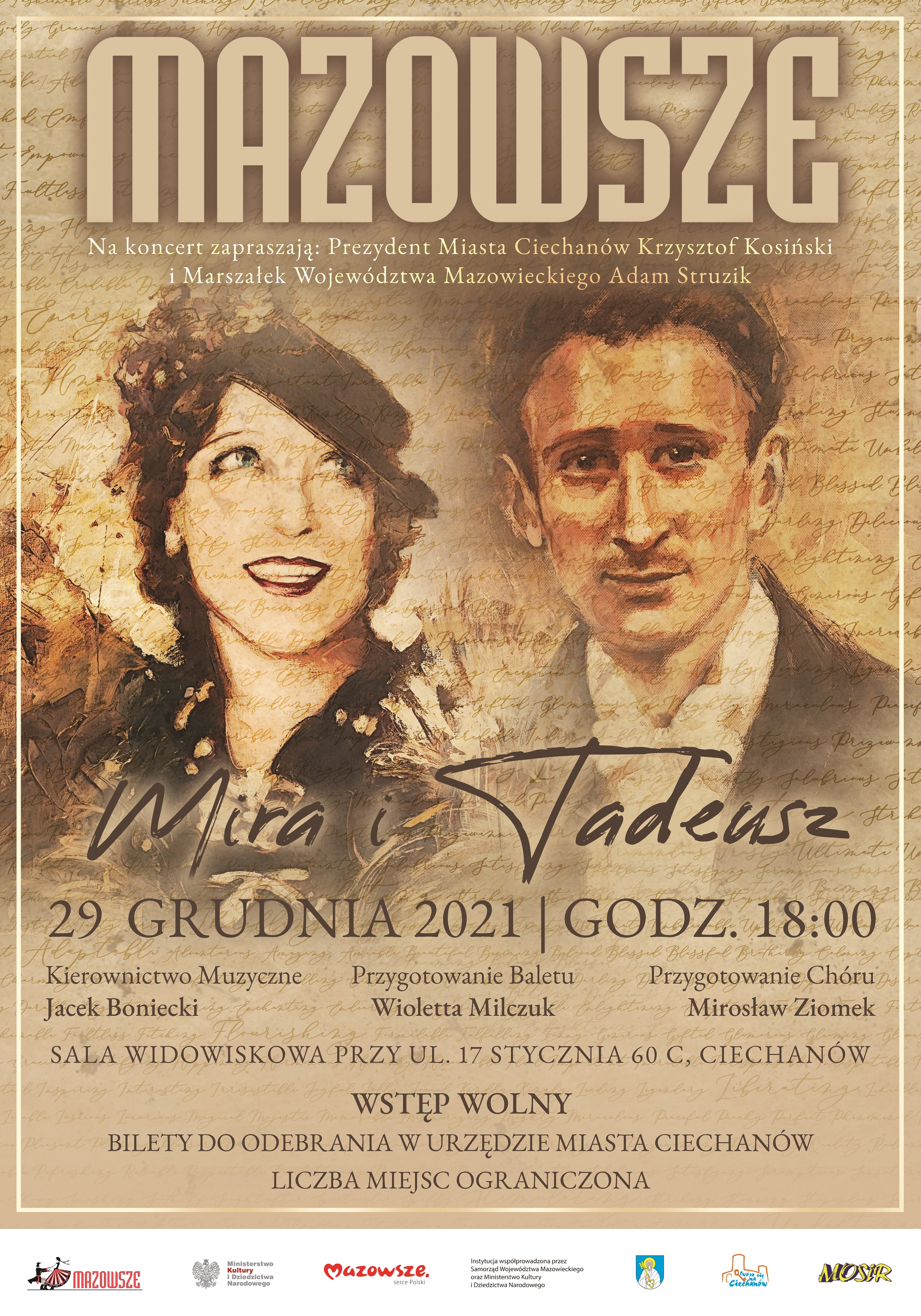29 grudnia w Ciechanowie będzie można obejrzeć widowisko pełne najpiękniejszych pieśni i tańców z repertuaru zespołu „Mazowsze”. Wystąpią soliści, balet, chór i orkiestra pod dyrekcją maestro Jacka Bonieckiego. Na koncert „Mira i Tadeusz” mieszkańców zapraszają Marszałek Województwa Mazowieckiego Adam Struzik i Prezydent Miasta Ciechanów Krzysztof Kosiński. Bezpłatne bilety można odbierać od 13 grudnia w Urzędzie Miasta.