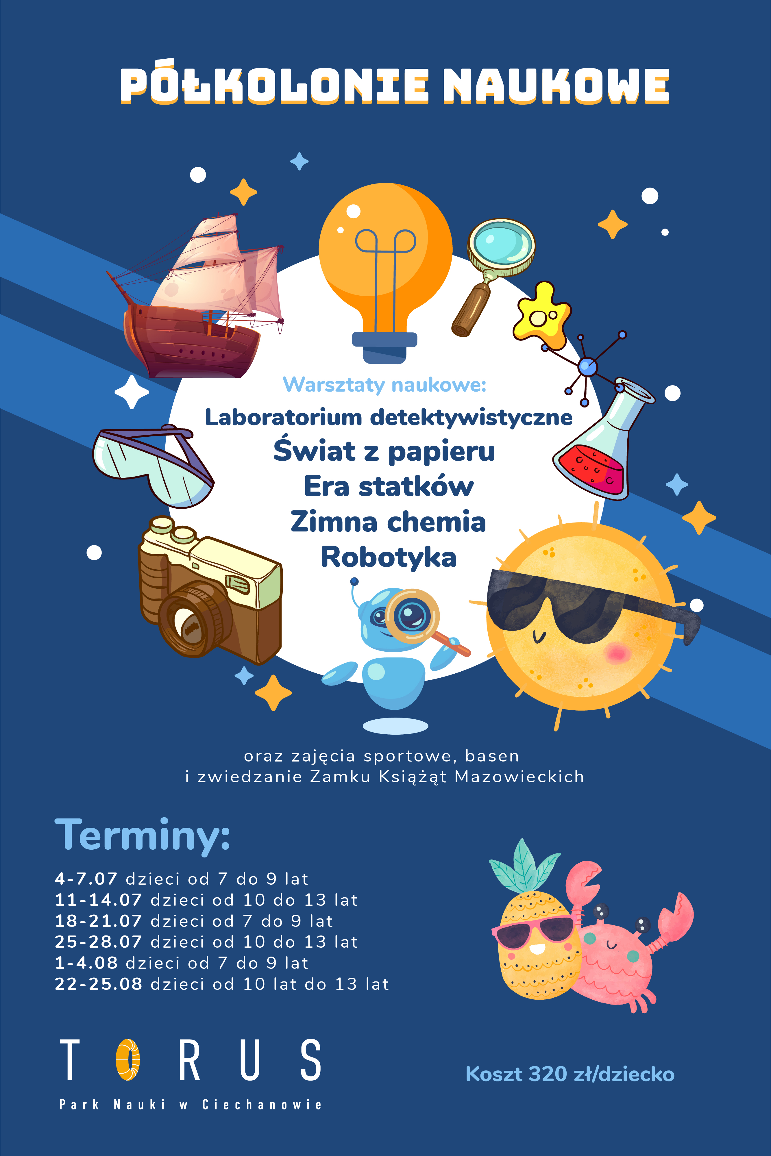 W gorące, letnie dni młodzi badacze wezmą udział w warsztatach z zimnej chemii. Uczestnicy półkolonii będą mieli również okazję budować i programować roboty z wykorzystaniem klocków Lego, rozwiążą zagadki bawiąc się w laboratorium detektywistyczne, odkryją magiczny świat origami, poznają prawa fizyki w trakcie budowania statków. Poza warsztatami naukowymi przewidziano zajęcia sportowe, zabawy na krytej pływalni oraz zwiedzanie Zamku Książąt Mazowieckich.