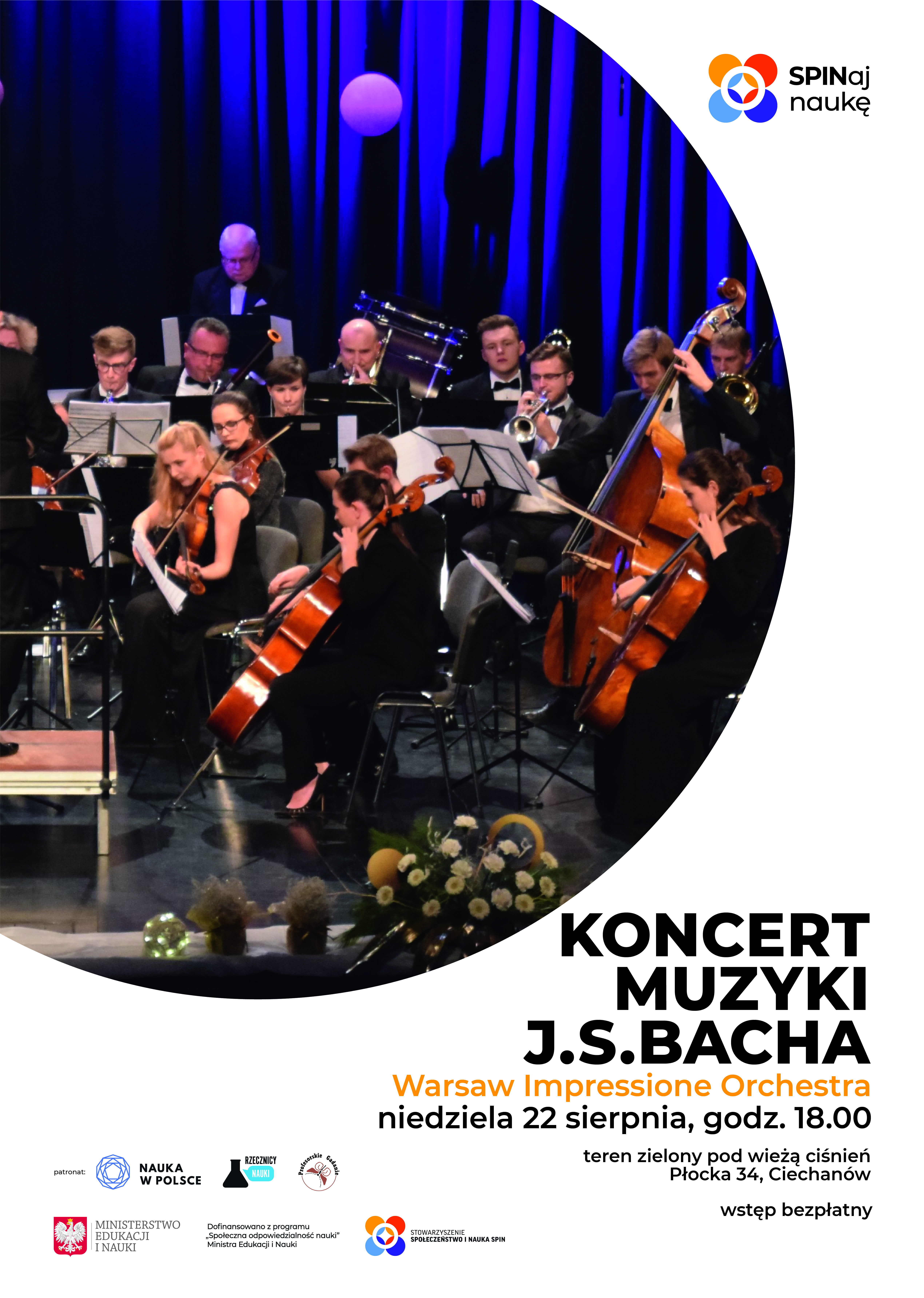 Grafika informująca o koncercie muzyki Bacha. Na białym tle po lewej w dużym kole znajduje się zdjęcie orkiestry. Po prawej u góry logo projektu . Niżej po prawej jest nazwa koncertu i dane organizacyjne.