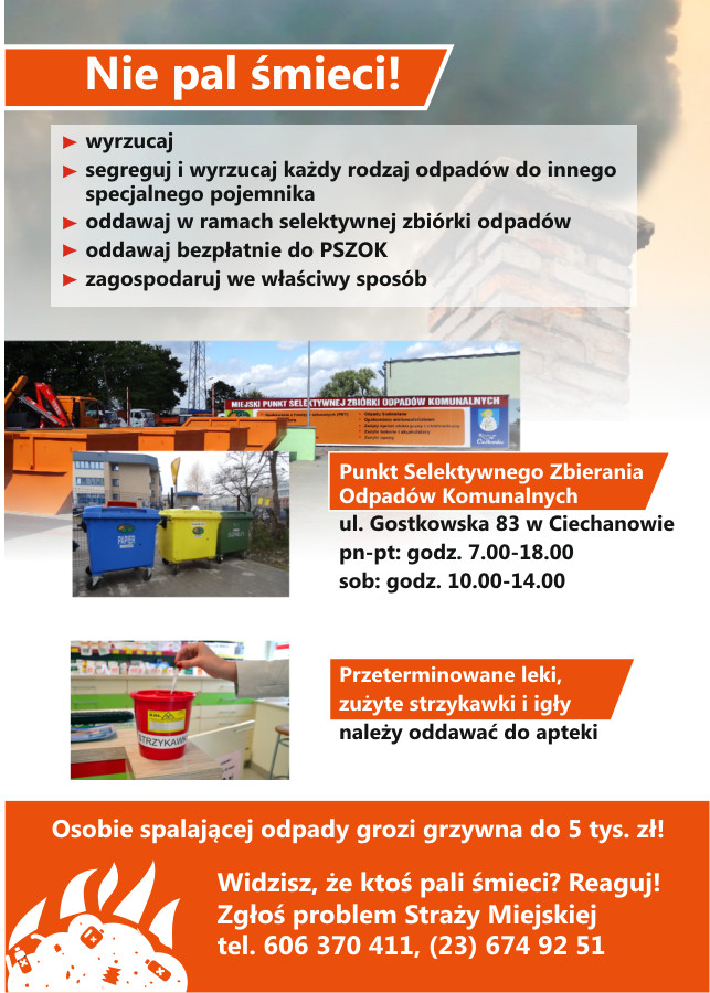 Strażnicy Miejscy prowadzą kontrole oraz edukują mieszkańców Ciechanowa w kwestiach zakazu palenia śmieci. Kampania edukacyjna ma na celu zwiększenie świadomości na temat szkód dla zdrowia wynikających z palenia śmieci w piecach. Dystrybuowana jest ulotka z informacjami m.in. o tym, jak należy w bezpieczny sposób pozbywać się odpadów oraz co grozi za ich spalanie.