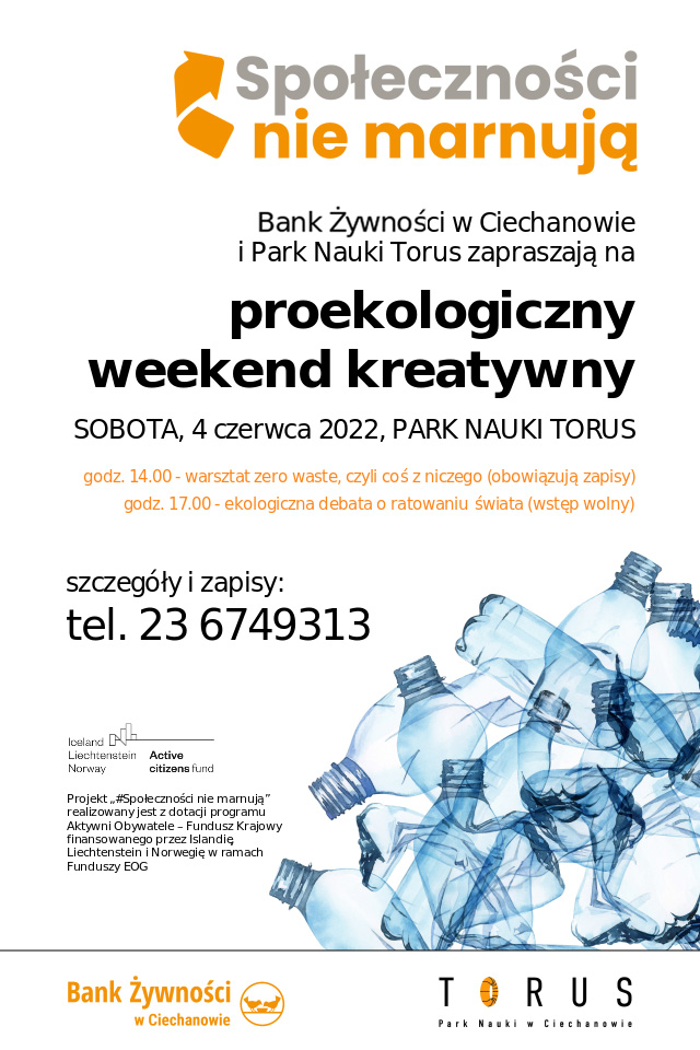 „#Społeczności nie marnują" to ogólnopolski projekt, którego celem jest promocja idei „Zero waste" na szczeblu lokalnym oraz wypracowanie proekologicznych polityk miejskich. W Ciechanowie zadanie zainicjował Bank Żywności. Przedsięwzięcie jest realizowane we współpracy z Urzędem Miasta. Do akcji włączył się Park Nauki Torus.