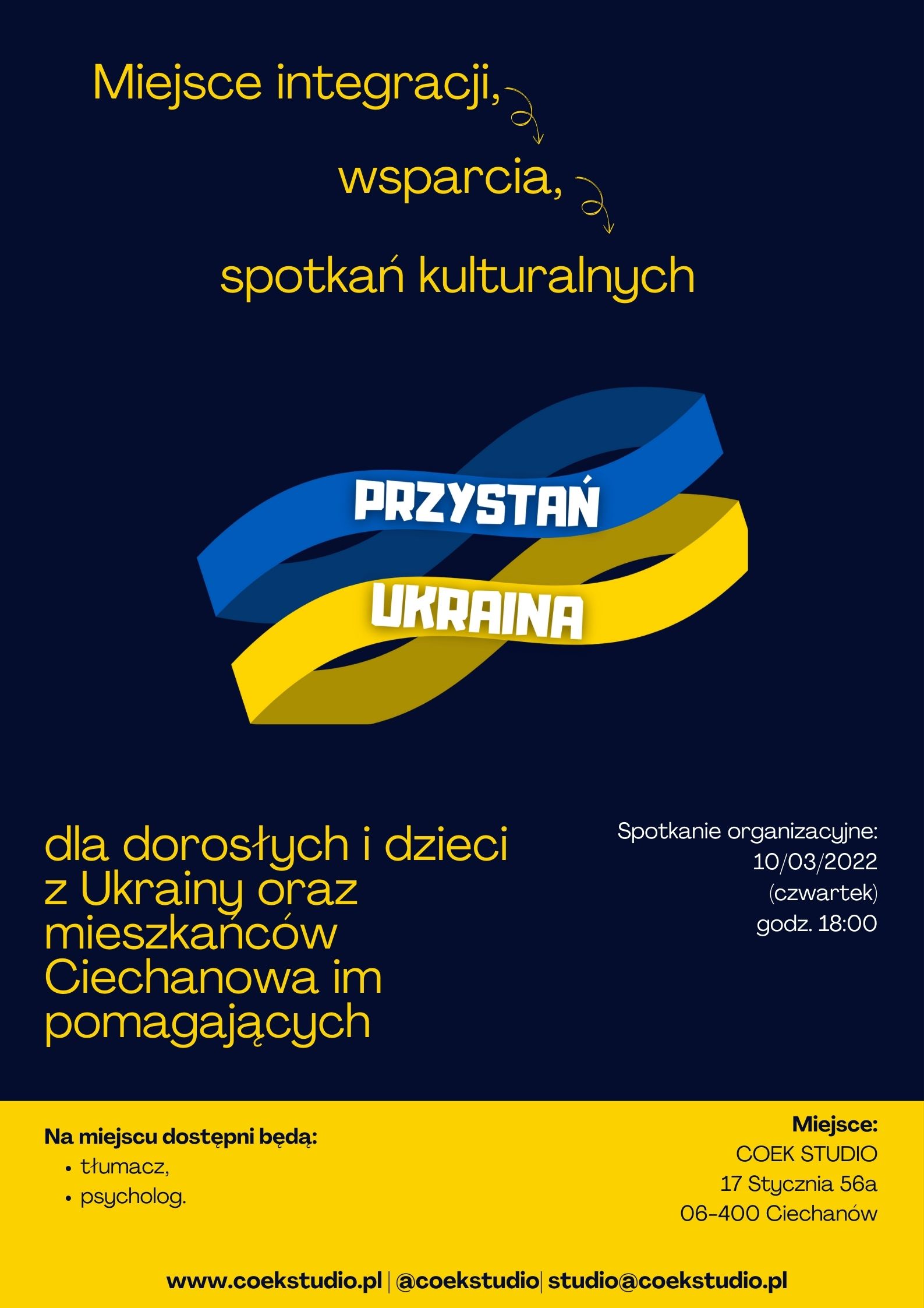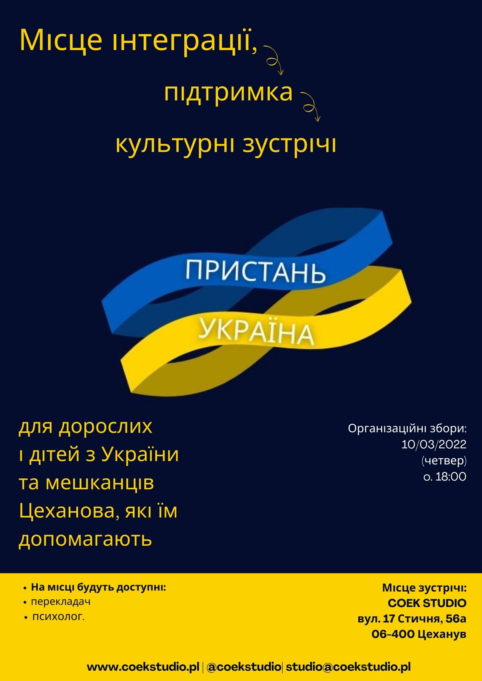 Pierwsze spotkanie „Przystani Ukraina” odbędzie się 10 marca (czwartek) o godz. 18.00 w siedzibie COEK STUDIO przy ul. 17 Stycznia 56a. Będzie prowadzone w języku polskim, ukraińskim i angielskim.