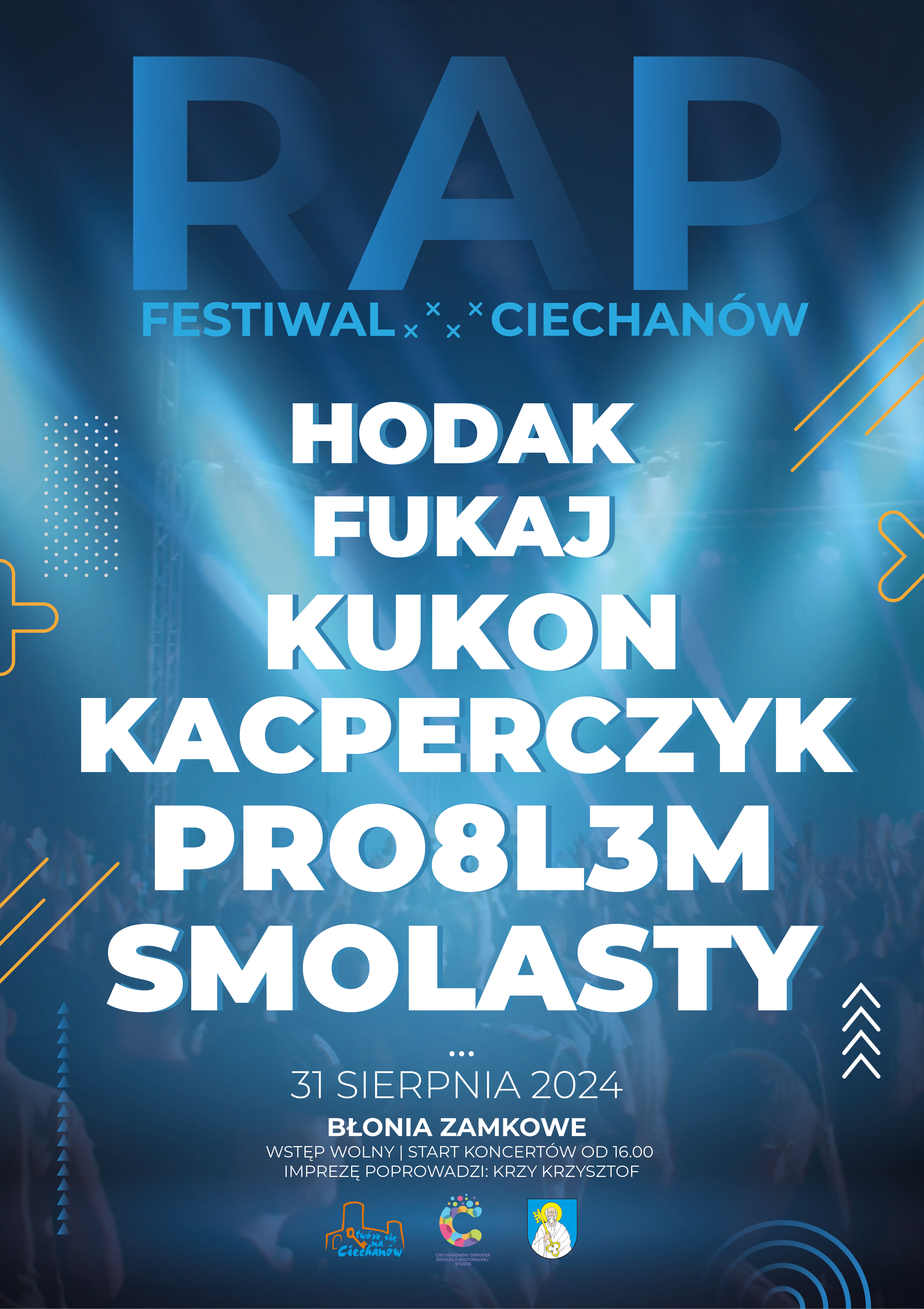 31 sierpnia na ciechanowskich błoniach odbędą się kolejne wakacyjne koncerty. Podczas tegorocznej edycji Rap Festiwalu na scenie wystąpią: Hodak, Fukaj, Kukon, Kacperczyk, PRO8L3M oraz Smolasty. Na błoniach tradycyjnie zlokalizowana będzie strefa foodtracków wraz z innymi stoiskami handlowo-gastronomicznymi.
