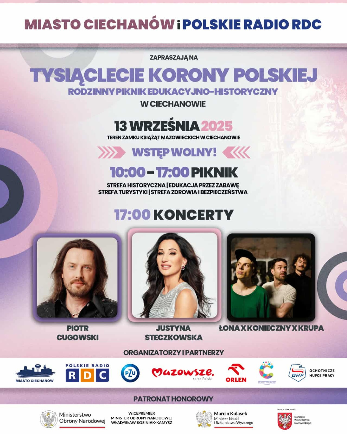 13 września (sobota) na błoniach i dziedzińcu Zamku Książąt Mazowieckich odbędzie się plenerowy piknik edukacyjno-historyczny oraz koncerty gwiazd polskiej estrady. Na scenie wystąpią: Łona x Konieczny x Krupa, Piotr Cugowski oraz Justyna Steczkowska. Wstęp na wydarzenia jest bezpłatny.