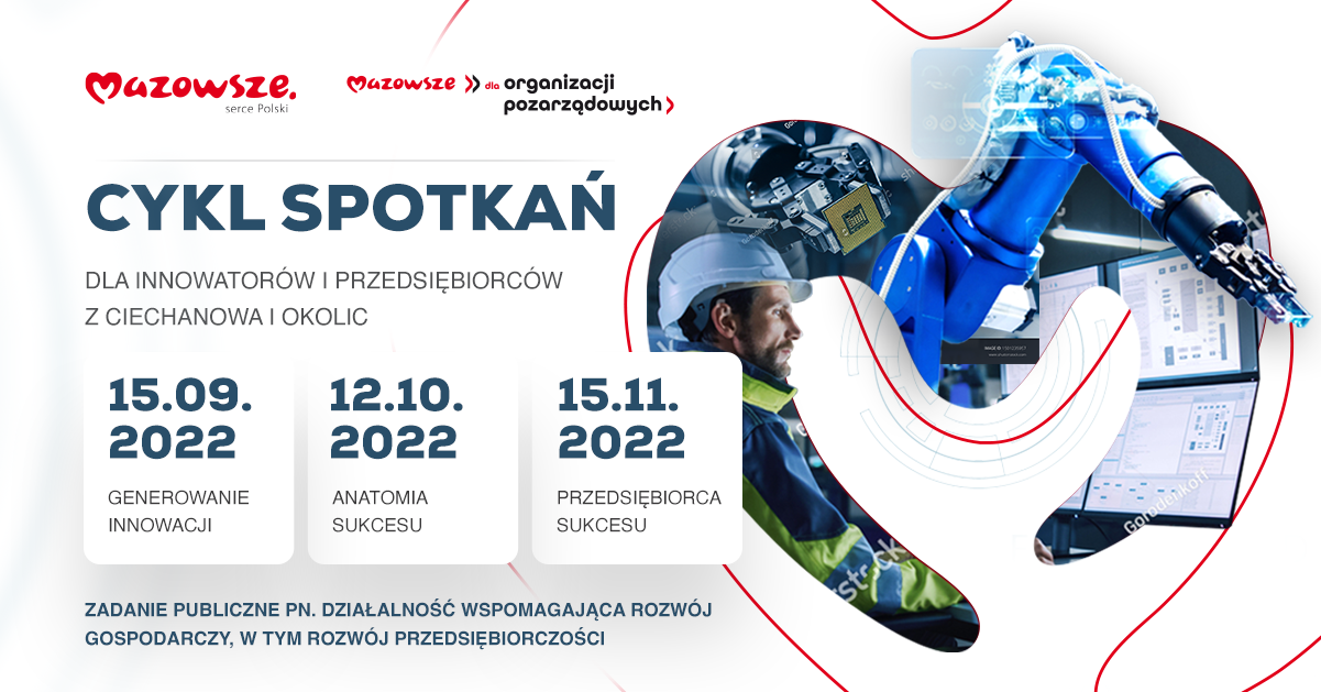 Uczestnictwo w programie jest bezpłatne. Pierwsze warsztaty z cyklu odbędą się 15 września 2022 r. (godz. 10.00) w Urzędzie Miasta Ciechanów. Ich tematem będzie generowanie innowacji i pozyskiwanie środków ze szczególnym uwzględnieniem finansowania w Przemyśle 4.0.