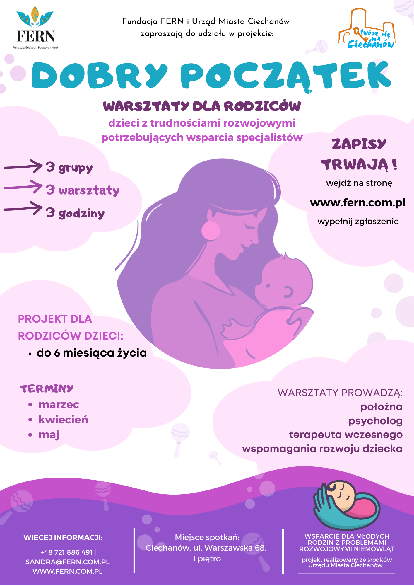 Cykl specjalistycznych warsztatów dla rodziców, u których nowo narodzonych dzieci do 6 miesiąca życia stwierdzono problemy rozwojowe wymagające wsparcia specjalistów ruszy 17 marca. To spotkania z położną, psychologiem oraz terapeutą wczesnego wspomagania rozwoju dziecka. Do udziału w projekcie należy się zgłosić poprzez formularz online znajdujący się na stronie fundacji www.fern.com.pl. Zapisy ruszają 14 lutego.