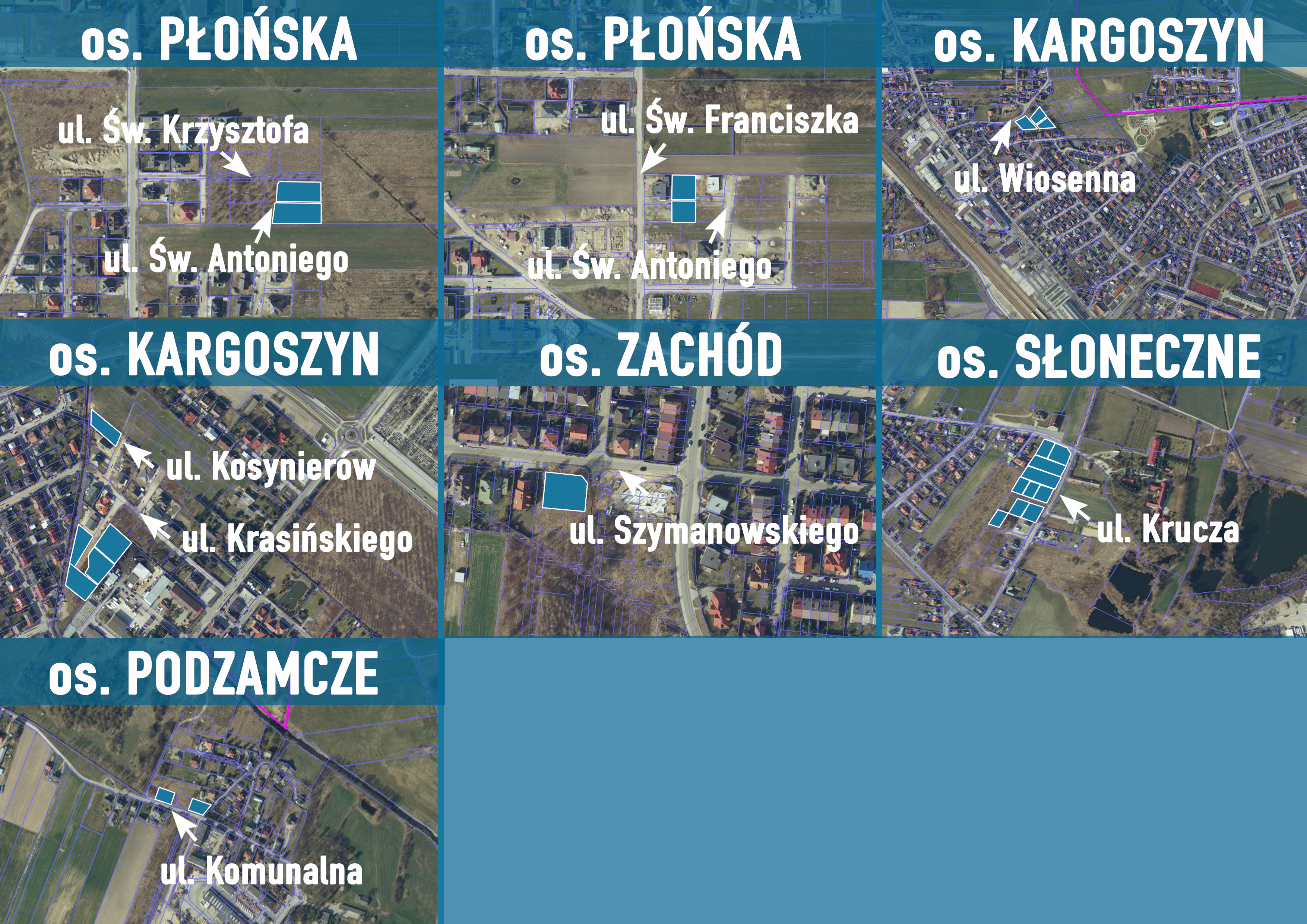 Poniższy plik graficzny zawiera fragmenty mapy z zaznaczonymi kształtami działek na sprzedaż, ulokowanymi w różnych częściach miasta. Wskazano tu nazwy miejskich osiedli i ulic, przy których znajdują się oferowane działki.