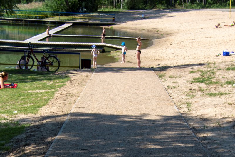 Prócz nowych alejek na terenie kąpieliska pojawiło się urządzenie zabawowe typu zamek (dwie wieże kwadratowe z dachem, pomosty z barierkami, zjeżdżalnia, rura pozioma, rura strażacka, kółko i krzyżyk) oraz 5 koszy na śmieci. Niebawem stanie tam także 8 stołów piknikowych z ławkami. Utworzona została ścieżka spacerowa wokół zbiornika głównego, dojście do zbiornika od ul. Dobrej a także dojścia do zbiornika dla wędkarzy. Ciągi komunikacyjne o szerokości 2 m i łącznej długości około 850 m składają się z warstwy mrozoochronnej z piasku drobnoziarnistego, z podbudowy z tłucznia kamiennego, z nawierzchni z mieszanki gliniasto-żwirowej oraz z betonowych obrzeży.