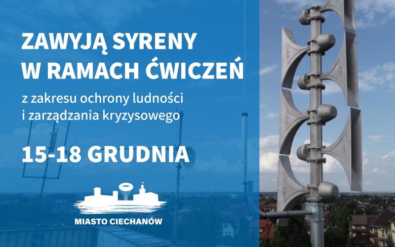 W dniach 15 - 18 grudnia w Ciechanowie odbędą się ćwiczenia z zakresu ochrony ludności i zarządzania kryzysowego. Zawyją syreny. Prosimy o zachowanie spokoju oraz niepodejmowanie żadnych działań.